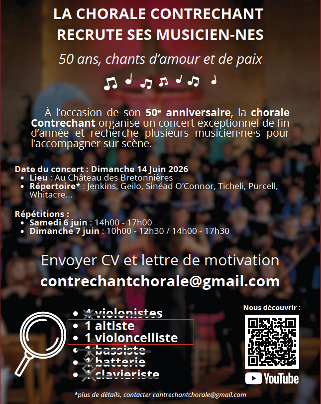Le 14 JUIN 2026, Contrechant fêtera ses 50 ans, au château des Bretonniéres de Joué lès Tours, en présence de tous ces chefs de chœur réunis autour des très nombreux choristes qui au fil de années ont partagé leur passion de chanter.